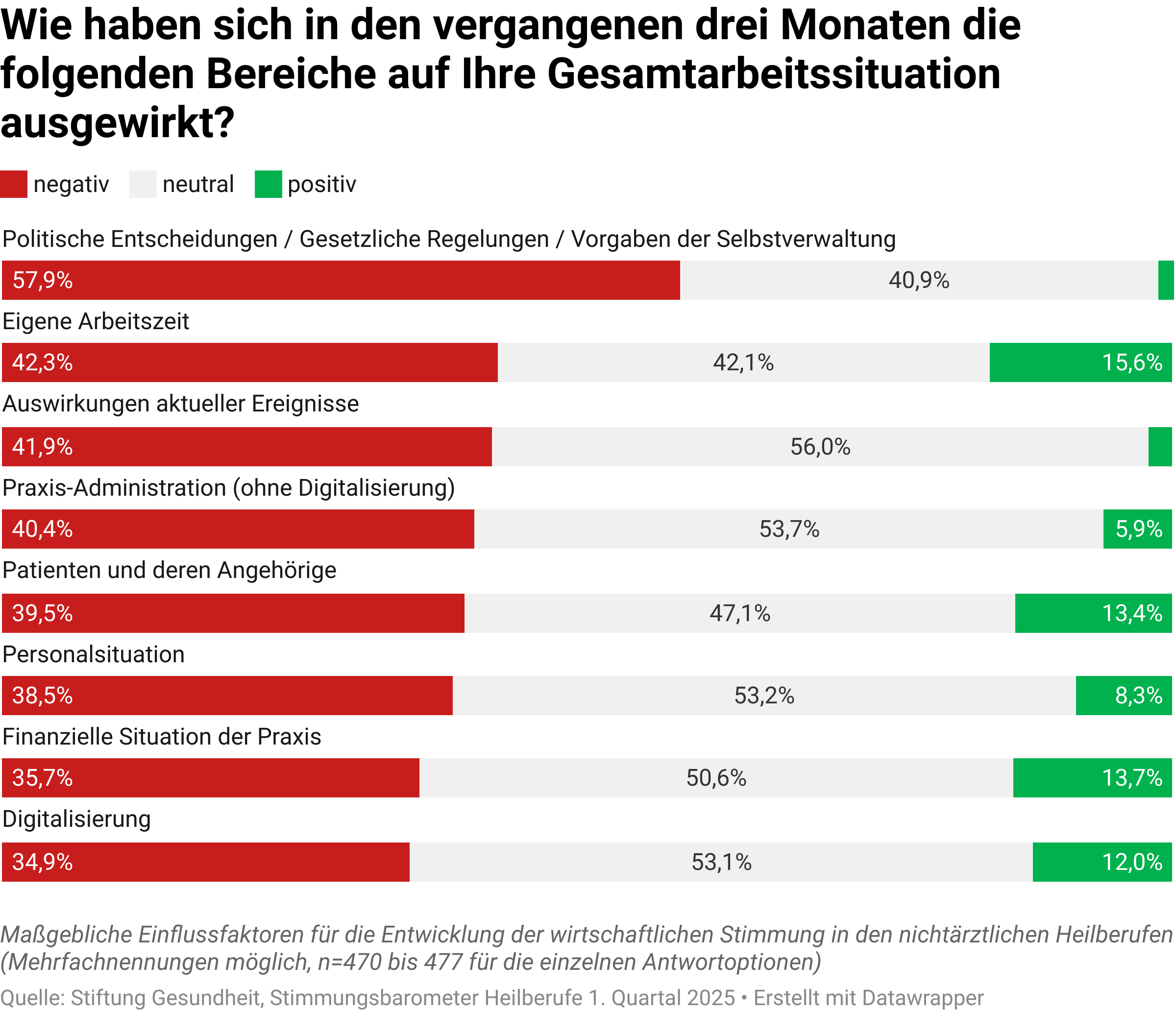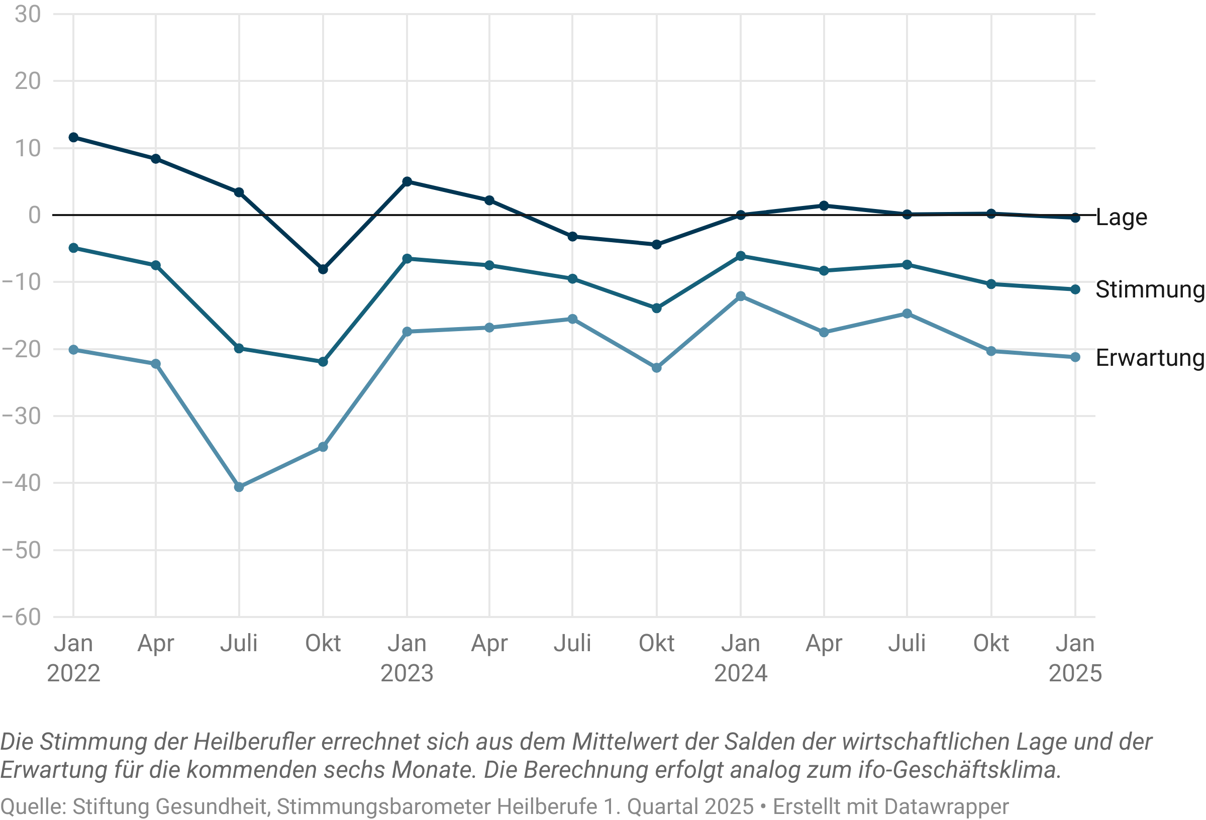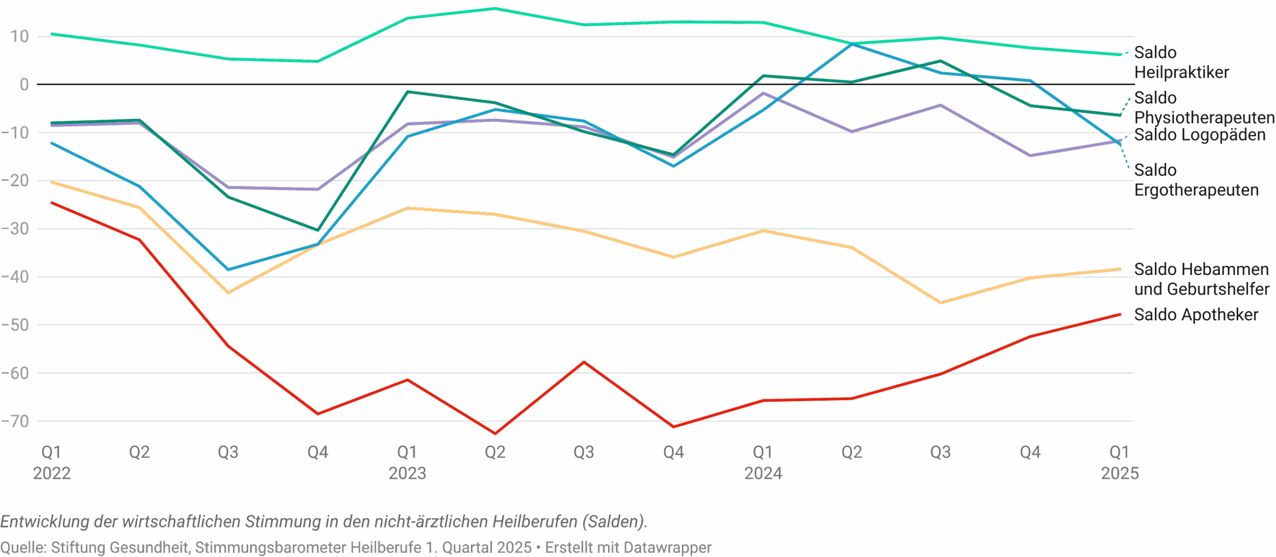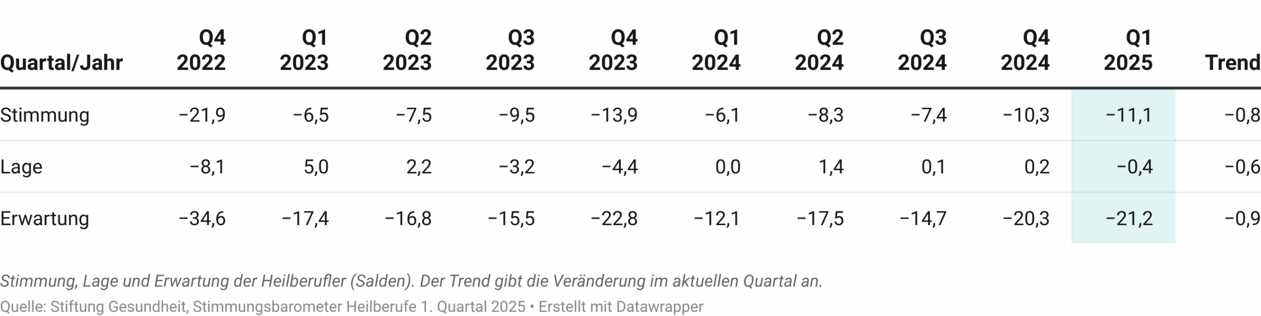 Die Stimmung der Heilberufler ist im 1. Quartal 2025 um 0,8 Punkte zurückgegangen. Mit einem Wert von -11,1 bleiben die Heilberufler damit insgesamt im zweistellig negativen Bereich.