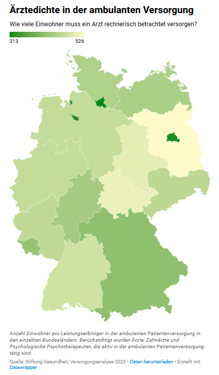 Wie groß die Unterschiede sind, zeigt die jüngste Versorgungsanalyse der Stiftung Gesundheit: Während es in Stadtstaaten wie Hamburg, Berlin und Bremen mehr als 300 ambulant tätige Ärztinnen und Ärzte pro 100.000 Einwohner gibt, stehen am anderen Ende der Skala Flächenbundesländer wie Brandenburg und Thüringen mit weniger als 200 Ärzten pro 100.000 Einwohner. Konkret bedeutet das: Während jeder ambulante Leistungserbringer in Hamburg rechnerisch betrachtet 313 Einwohner versorgen muss, sind es für ihre Kollegen in Brandenburg mit 526 Menschen fast doppelt so viele.